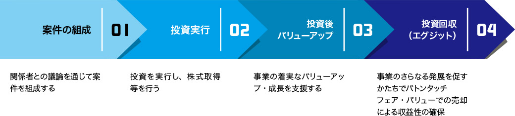 当社の投資活動は、「オープンイノベーションを通じた次世代産業の育成による国富の増大」というミッション実現のため、明確な投資戦略に基づいて運営されています。当社の投資活動には、大きく分けて以下の4つのプロセスがあります。